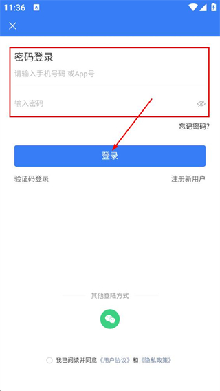 4、在密码登录页面,填写手机号和密码,点击登录,完成登录操作。