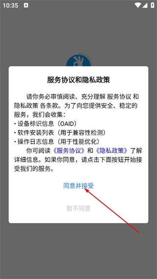1、阅读服务协议和隐私政策后,点击同意并接受按钮,进入登录注册页面。