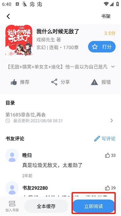 2、在书城中随意的打开一部小说作品,进入到【详情界面】;