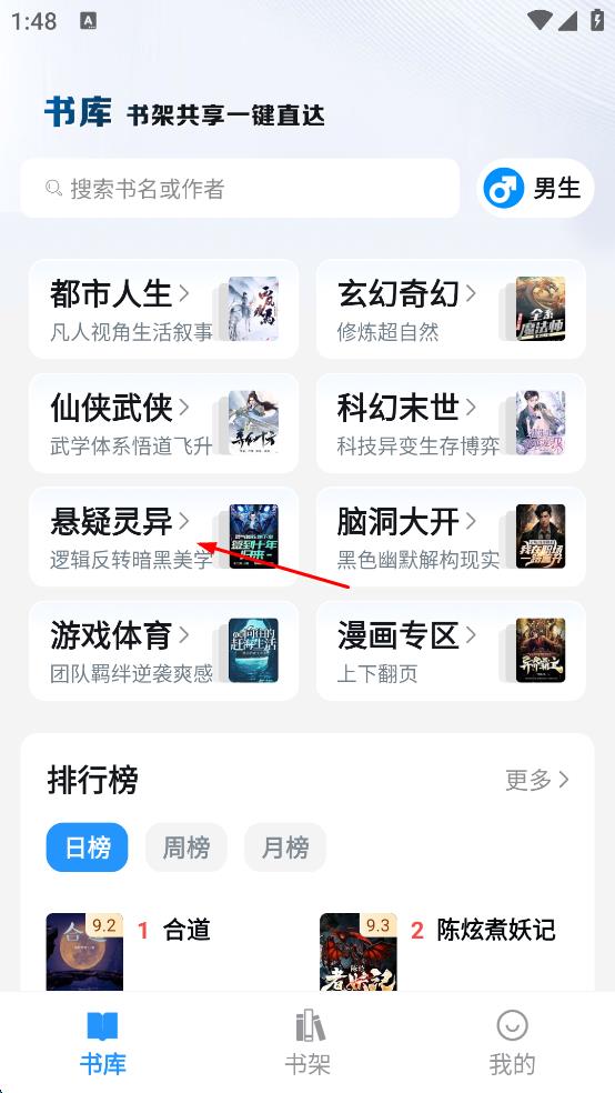 1、打开小说阅读软件,进入书库界面,界面有“都市人生”“玄幻奇幻”等小说分类,还有排行榜板块,点击感兴趣的分类。