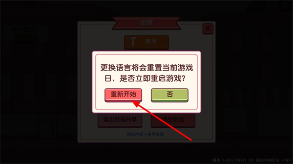 4、在弹出的确认弹窗中,点击重新开始按钮,重启游戏以应用日语版的设置。