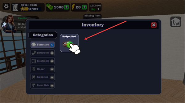 3、进入酒店房间区域后,打开库存界面,从分类列表中选择家具类设施,如经济型床具,选定所需物品为房间布置做准备。