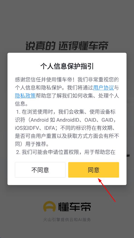 1、打开懂车帝APP,在弹出的个人信息保护指引界面,找到“同意”按钮,点击该按钮。