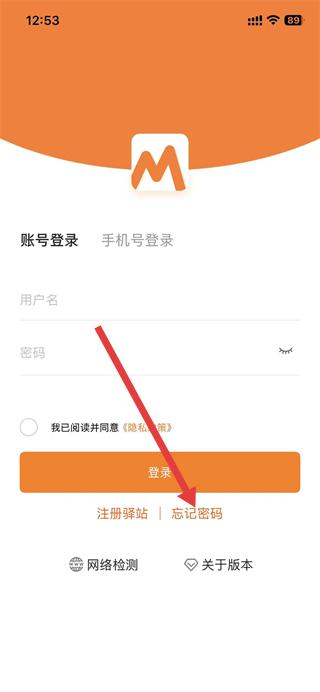 1、打开妈妈驿站App的登录界面,点击忘记密码选项。
