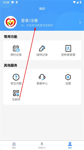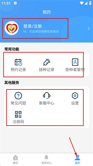 1、打开首都疫苗服务app,点击底部导航栏中的我的选项。