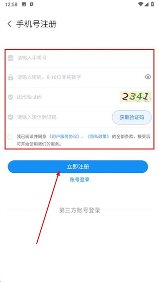 4、输入手机号、密码、图形验证码、验证码,勾选服务协议,点击立即注册。