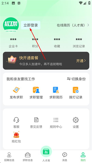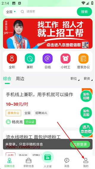 1、进入招工帮后,点击底部的我的选项,可进入个人中心页面。