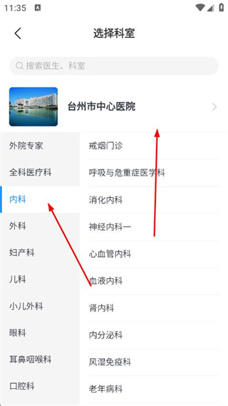 3、在选择科室页面选择就诊科室,进入门诊选择页面。