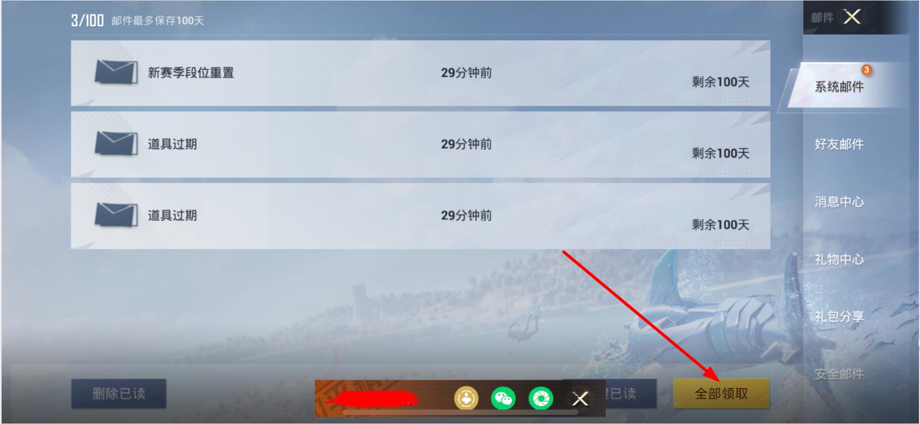 3、点击全部领取按钮,可领取邮件中的奖励如有。