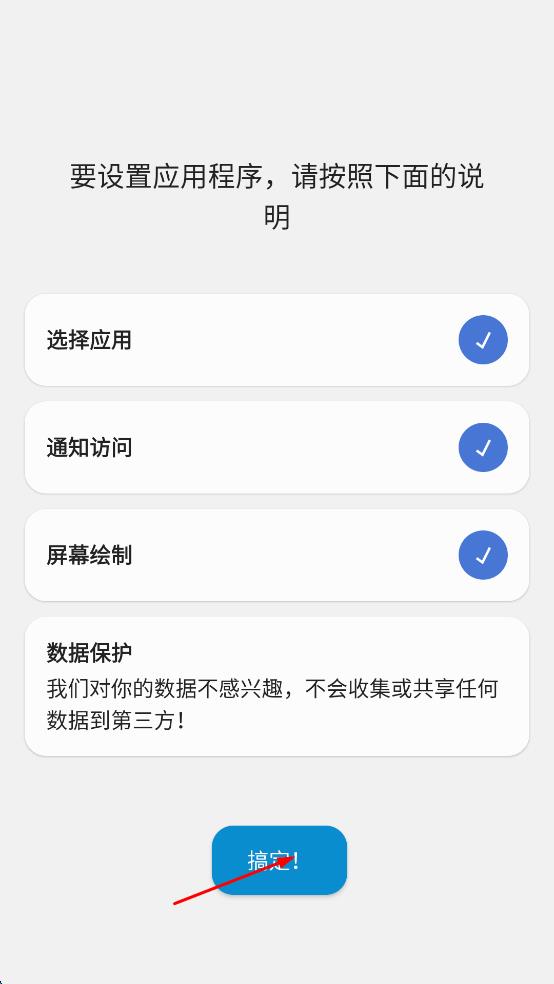 2、在设置说明页,确认“选择应用”“通知访问”“屏幕绘制”均完成勾选,点击“搞定”,完成基础设置。