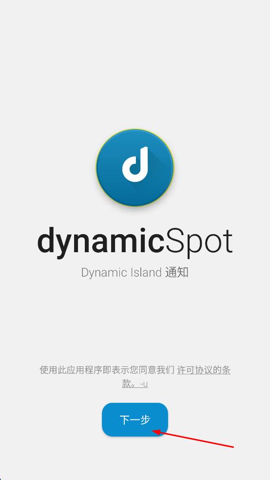 1、打开dynamicSpot应用,进入初始页面,阅读使用许可协议相关提示后,点击“下一步”,进入设置引导界面。