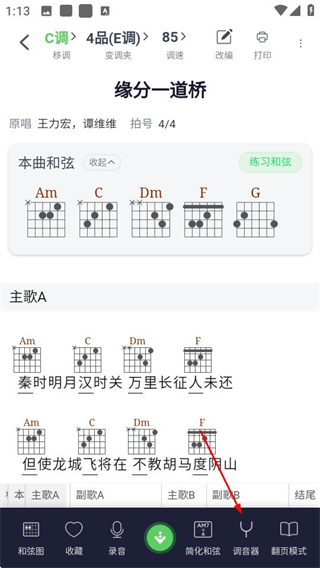 3、在曲谱详情页面,点击调音器选项,可进入调音器页面。