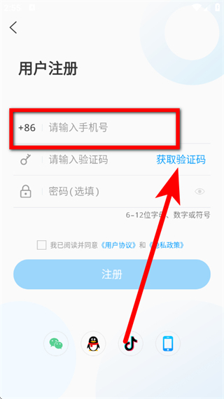 4、在用户注册页面,输入手机号,点击获取验证码。