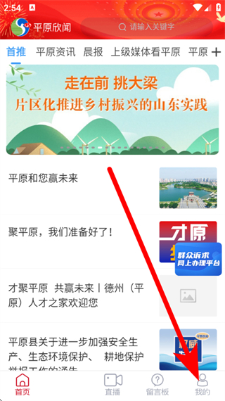 1、在平原欣闻首页,点击底部我的,进入个人页面。