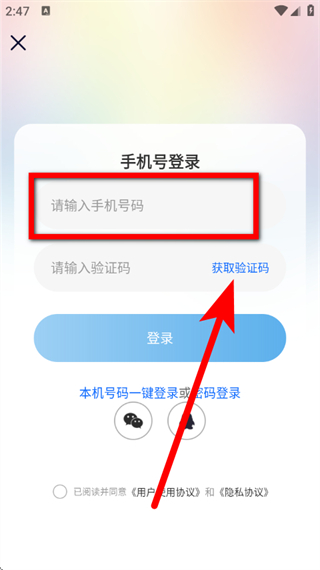 3、在手机号登录页面,输入手机号码,点击获取验证码。