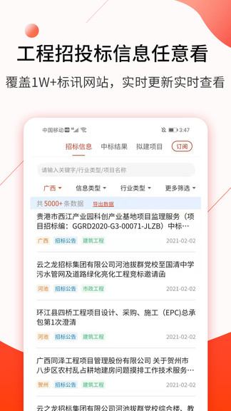 1、每天更新100000+的工程行业招投标资讯,提供10000+工程拟建项目信息,给您提供招标信息订阅、标讯数据导出功能、拟建项目获取、招标项目关注等服务;