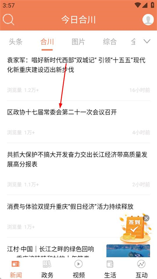 1、进入今日合川后,点击目标新闻条目,可进入该新闻的详情页面。