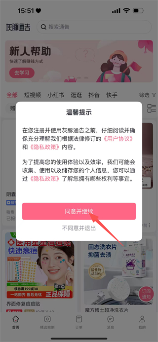 1、阅读用户协议和隐私政策后,点击同意,进入灰豚通告的首页。