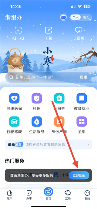 1、在浙里办首页点击立即登录按钮,跳转到登录页面。