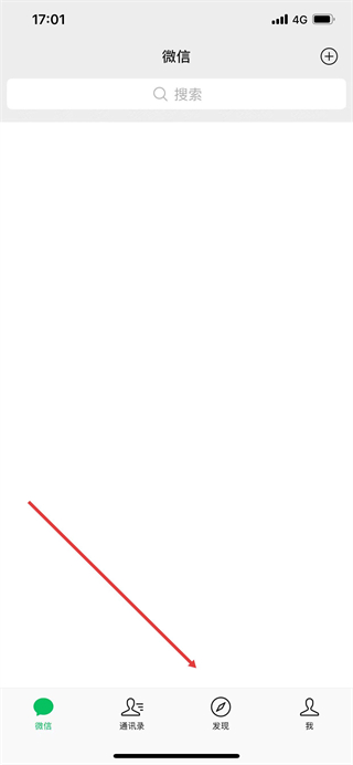 1、在微信主界面,点击底部发现选项,进入发现页面。
