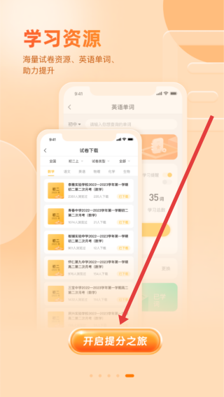2、在学习资源界面,点击橙色开启提分之旅按钮,随后进入账号登录准备环节,即将开启登录流程。