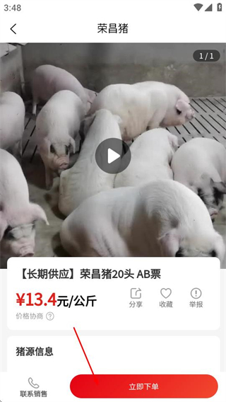 3、在猪源详情页面,点击立即下单按钮,即可完成买猪流程。