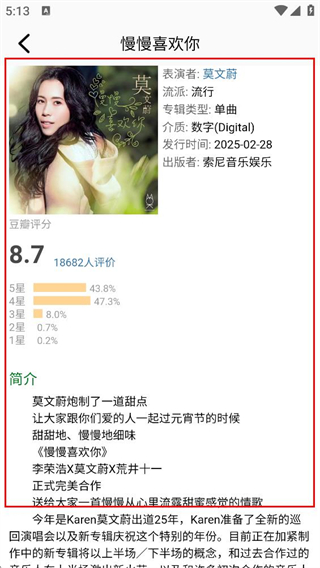 3、在慢慢喜欢你的详情页面,即可查看该歌曲的表演者、评分、简介等信息。