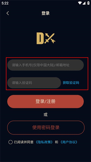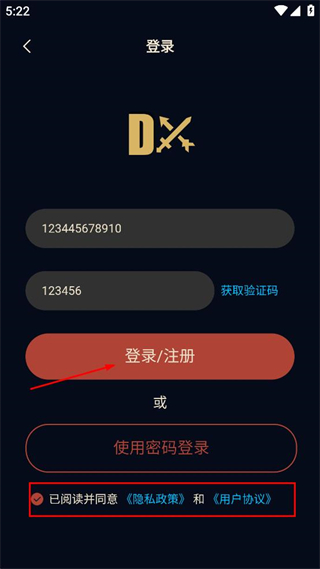4、勾选已阅读并同意的选项,点击登录/注册按钮,完成账号登录操作。