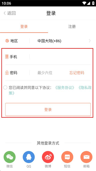 4、进入登录界面后,可选择填写手机密码,或勾选协议后点击登录,也可选其他方式。