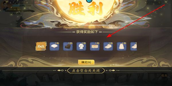 4、对局胜利后会弹出奖励界面,可获得元宝和装备等奖励,点击确定或空白处关闭界面,奖励会自动到账。