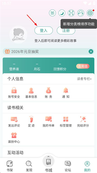 1、打开晋江文学城,进入书城界面后,点击底部导航栏的我的选项进入个人页面。