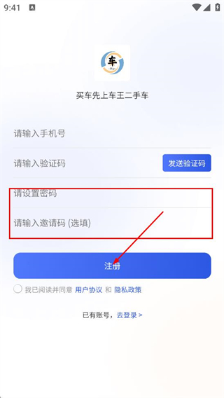 4、在注册页面,填写密码及邀请码,点击注册按钮,完成账号注册。