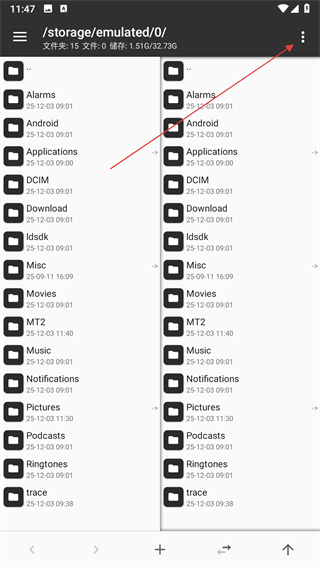 1、打开MT管理器,进入文件管理页面后,点击三点图标。