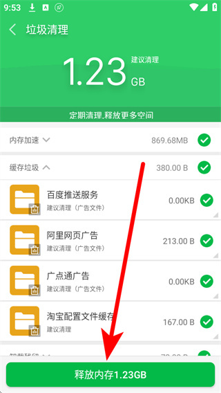 4、在垃圾清理页面,点击底部的释放内存,即可完成手机垃圾清理操作。