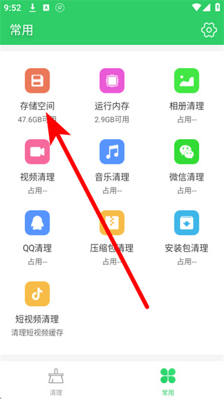 3、在常用功能页面,点击存储空间,进入垃圾清理页面。