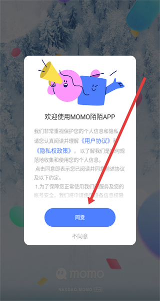1、在陌陌APP的“用户协议与隐私权政策”弹窗点击“同意”,进入登录界面。