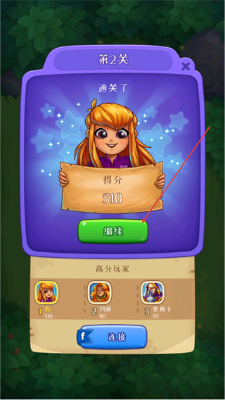 4、通关后获得得分,点击继续进入下一关,推进游戏进程。