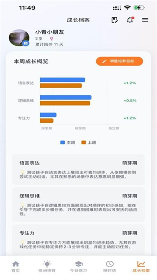 拥有详细的孩子成长档案记录功能,全面整合孩子成长轨迹日常表现练习结果等信息,可查看孩子每周的成长概览信息,内容全面且条理清晰,方便家长整体把握孩子成长状况。