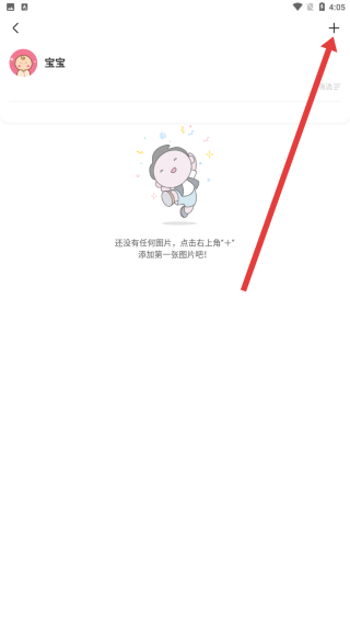 2、进入宝宝页面后,用户可以点击右上角+按钮,跳转至选择照片界面,准备上传宝宝照片。