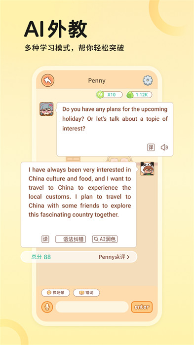 5、角色聊天:和应用内的角色进行聊天对话,练习口语表达解能力,加深对词汇的理解。