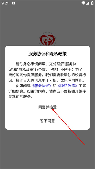 1、阅读服务协议和隐私政策后,点击同意并接受,进入登录页面。