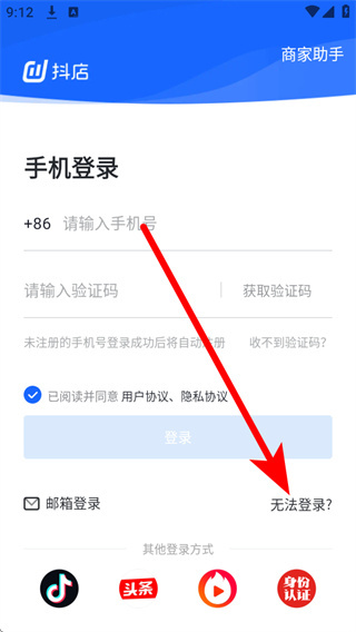 1、打开抖店,进入手机登录页面后,点击页面中的无法登录。