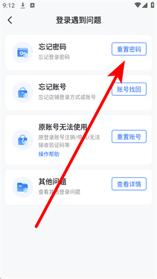 2、在登录遇到问题页面,点击忘记密码选项,进入重置密码界面。