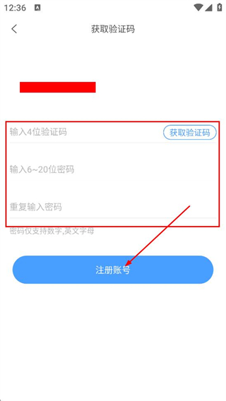 4、在获取验证码页面,填写验证码、密码并重复输入密码,完成后点击注册账号完成注册操作。