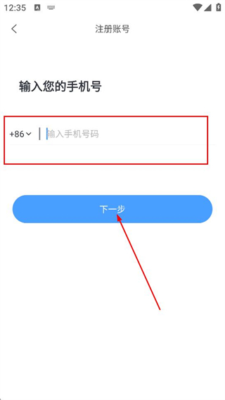 3、在注册账号页面,填写手机号对应的内容,点击下一步,进入验证码及密码设置页面。