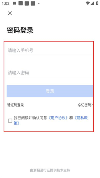 4、在密码登录页面,填写信息并勾选协议后,点击登录按钮即可完成账号登录。