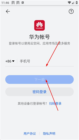 3、在华为帐号界面,输入要注册的手机号码,点击下一步进入验证码填写页面。