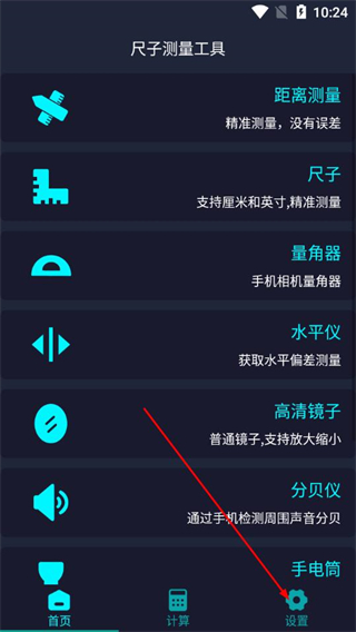 1、在尺子测量工具首页,点击底部设置选项,进入设置页面。