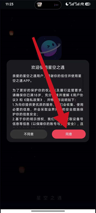 1、打开星空之遇,弹出弹窗后,点击同意,进入登录方式选择页面。