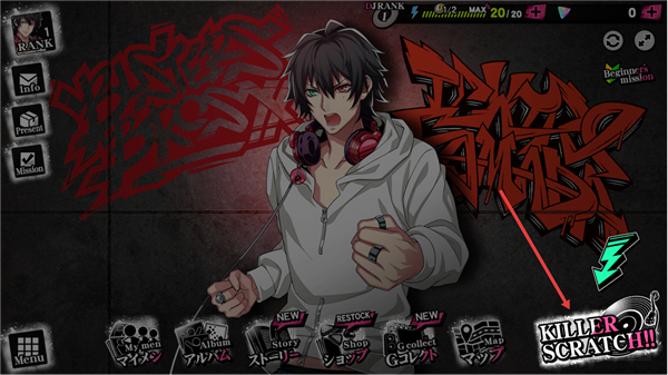 1、主界面展示已选角色,右下角KILLER-SCRATCH是搓盘功能入口,点击可触发专属节奏互动,配合表演提升效果,是该作嘻哈表演的特色操作之一。